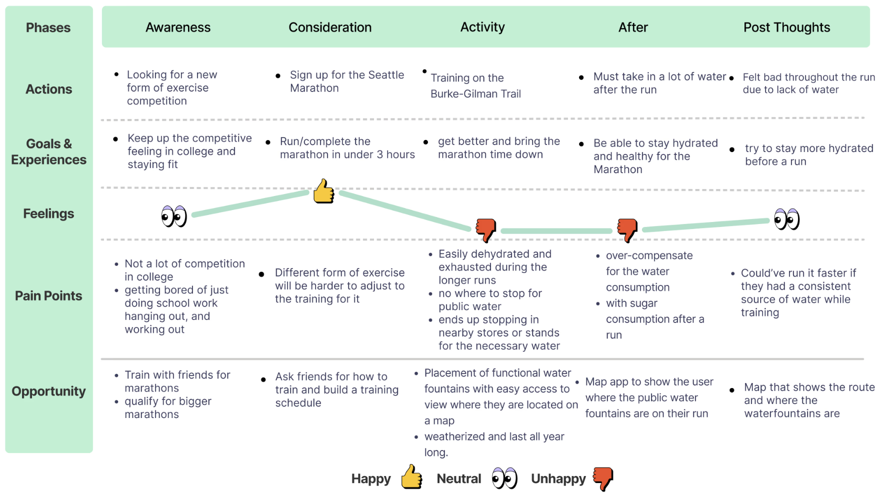 Our user journey map for Jonny Jones outlined the marathon training experience, highlighting key actions, thoughts, and emotions throughout his journey. This visualization helped us identify major pain points and opportunities to enhance the user experience, ensuring our design addressed the real challenges runners face.